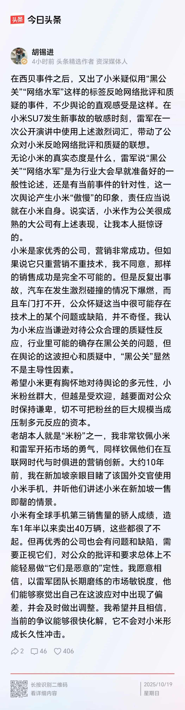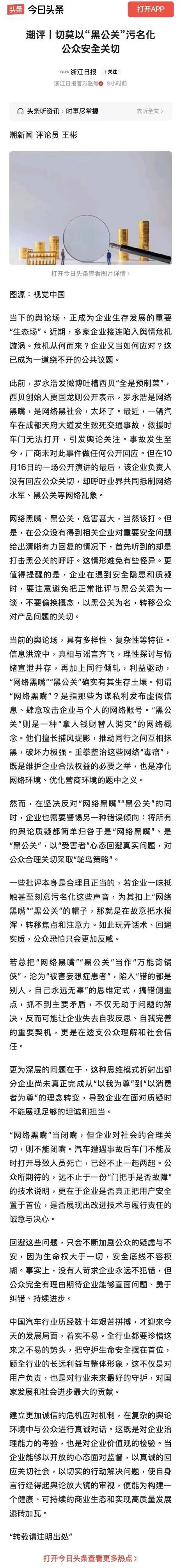 小米总说这是黑公关在搞鬼,觉得网上骂他们的都是水军,专门来抹黑,可这话一说,更多人就信不过了,胡锡进转了党媒的评论,说老百姓问技术问题,不能动不动就扣黑公关的帽子,小米这态度,让人觉得太硬气了,专家们私下也在议论小米汽车,作者就问,那些懂行的人,真会为了几块钱说话吗,他们的话,比普通网友说得更管用。