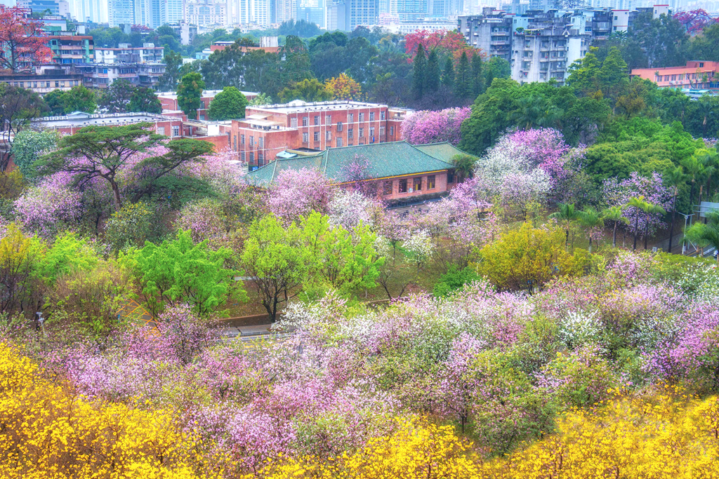 在华南农业大学欣赏黄花风铃木与紫花风铃木的金紫交响,漫步于如霞似锦的宫粉紫荆花径,沉浸校园春日的浪漫画卷;步入华南植物园,观赏温室与湖岸边的多样珍稀花卉,领略科研自然交融之美;最后抵达广东树木公园,漫步森林栈道,沉浸森林花语与草木清香,体验城市绿肺的静谧生机。